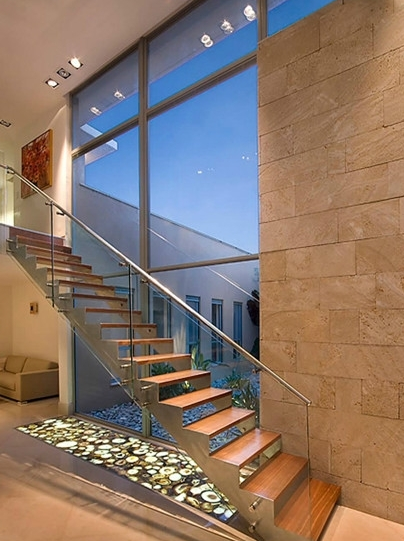 玻璃:本身所具有的通透感在用做樓梯裝飾時,效果更是不凡?,F(xiàn)在市場上有噴花玻璃和鑲嵌玻璃,可以把它用在樓梯扶欄處,更絕妙的用法是將樓梯臺階做成中空的,內(nèi)嵌燈管,以特種玻璃做踏腳板,做成可以發(fā)光的樓梯。